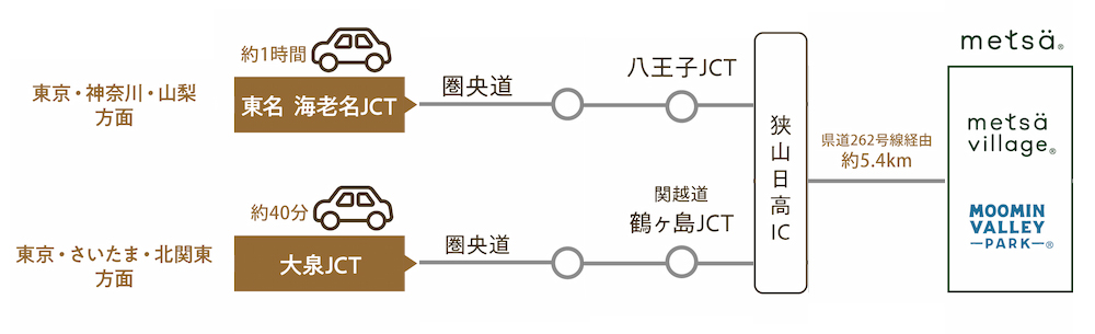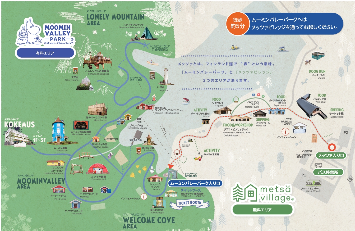 「メッツァビレッジ」「ムーミンバレーパーク」へお越しのお客様は、電車とバス(公共交通機関・無料シャトルバス・直行バス)またはお車、自動二輪車および自転車をご利用いただけます。