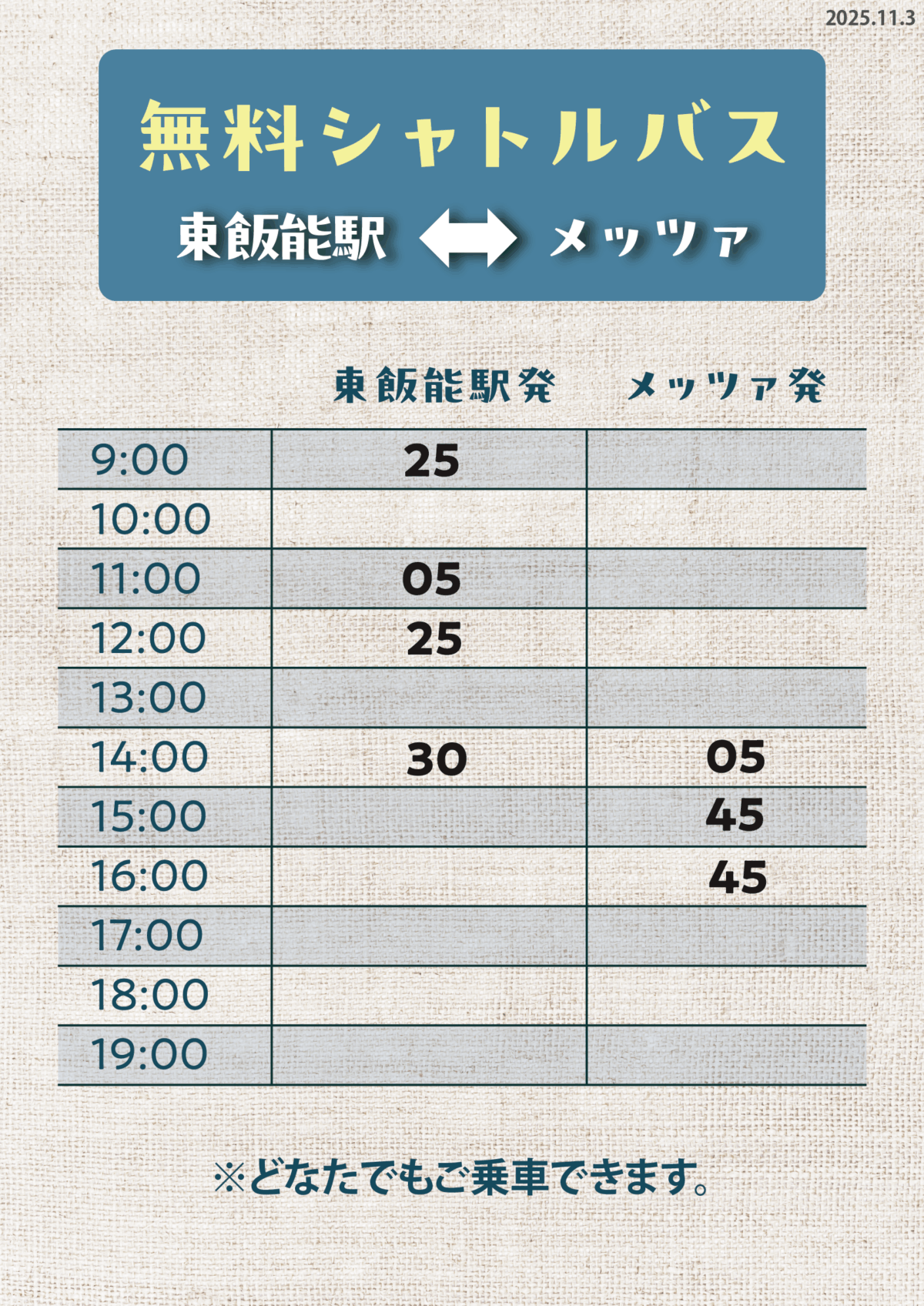 【東飯能駅発着・無料シャトルバス発車予定時刻】