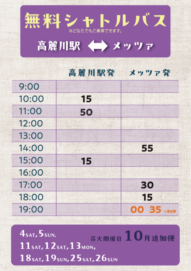 【高麗川駅発着・無料シャトルバス案内】