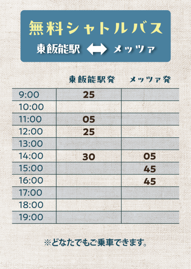 【東飯能駅発着・無料シャトルバス案内】