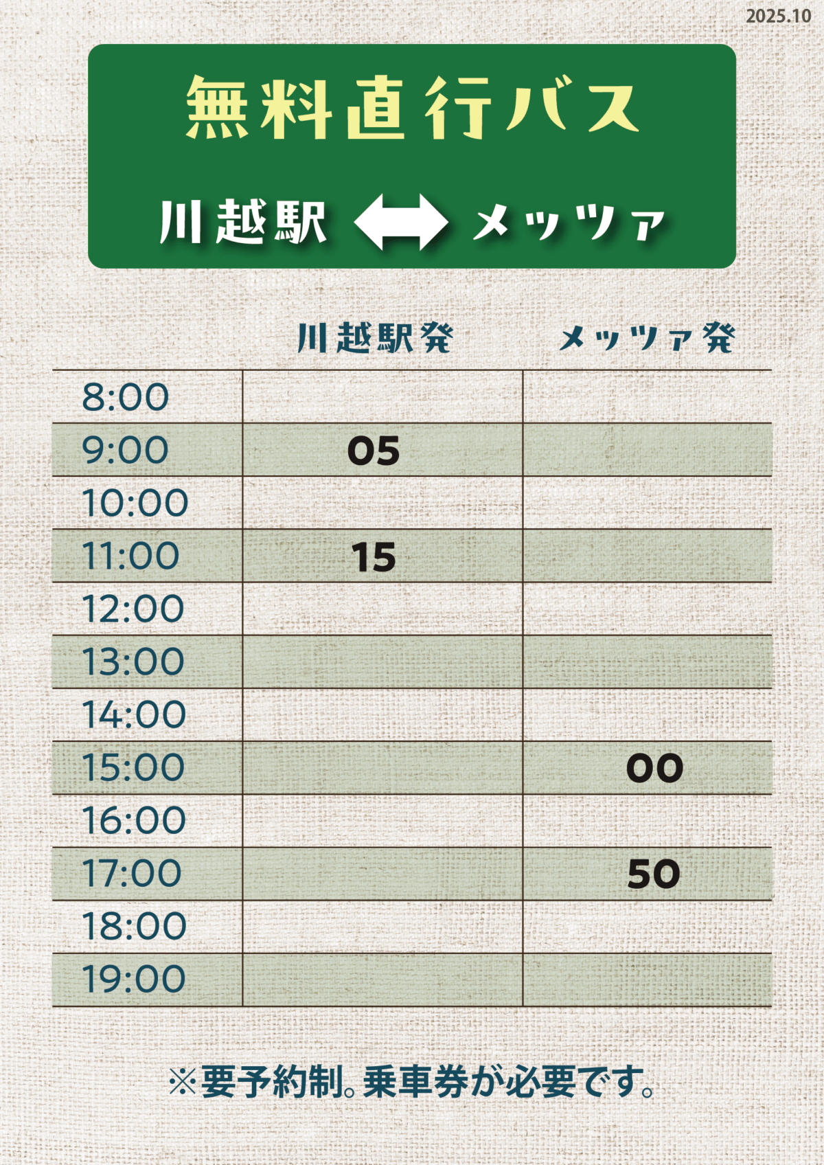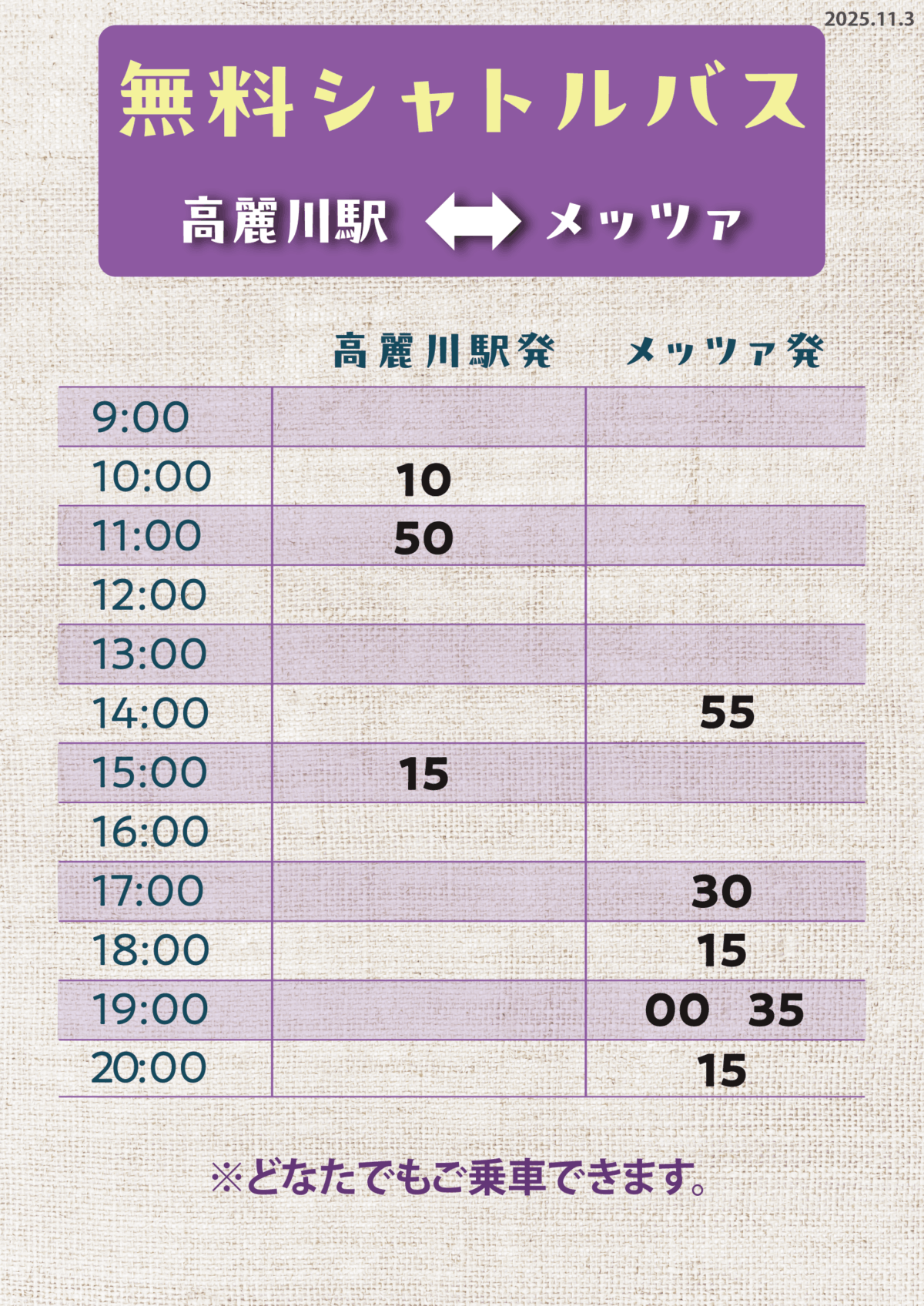 【高麗川駅発着・無料シャトルバス発車予定時刻】