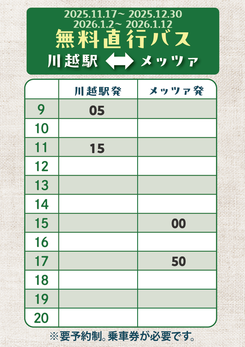 ※チケットは往復ですが、メッツァ発のバスは時間指定ができません。もしご希望のバスに乗車できなかった場合は、その後の高麗川駅行無料シャトルバスをご利用いただくとスムーズです。