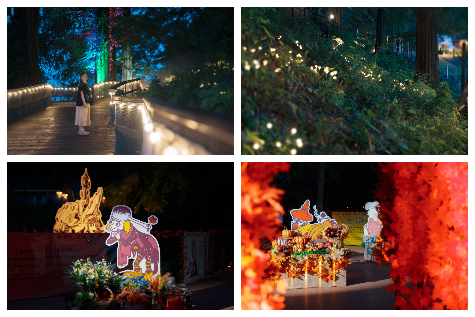 秋の装飾に加え、ライトアップ演出も秋仕様にバージョンアップ。木々はまるで一足早い紅葉が始まったかのような色づきを見せ、りんごをイメージしたバルーンはまるで宝石のように輝きます。また、ムーミンパパの思い出を再現したテラスは、キャラクターたちがそれぞれライトアップされ、昼とは違う雰囲気でお楽しみいただけます。期間中の土日祝には「ムーミン谷の湖上花火大会」が開催され、パーク内のイルミネーションもゆったりとご鑑賞いただけます。幻想的な光のアートをお楽しみください。
