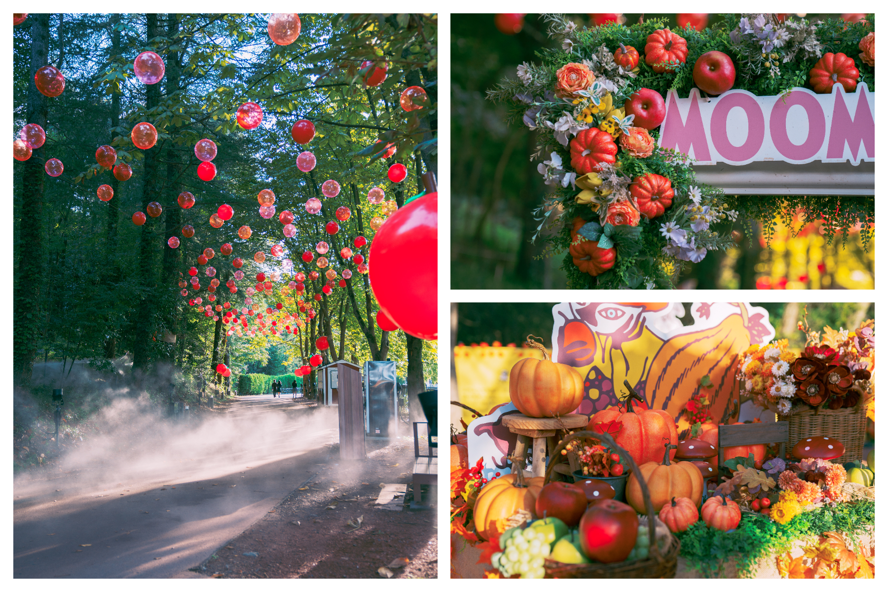 はじまりの入り江エリアから、ムーミン谷エリアへと向かう湖畔の道には、りんごをイメージしたバルーンデコレーション。フォトスポットや花壇も秋の花や果実で華やかに彩られています。大きなりんごと一緒に写真を撮ったり、秋の風を感じながら色づく木々を楽しみながら散歩したり。歩くだけで「ムーミンの物語」に触れることができるイベントです。