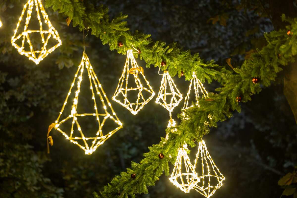 フィンランドの伝統工芸品「ヒンメリ」をモチーフに、メッツァのエントランスロード約100mに渡って装飾される「天空のヒンメリロード」。高さ最大約100cmの大ヒンメリを中心に、大小さまざまな100個のヒンメリがメッツァ入口の並木道を優しく彩ります。