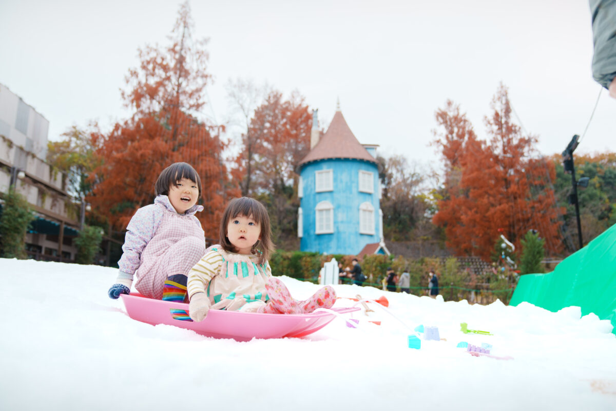 「ムーミン谷でゆきあそび」では、まるで物語の世界に入り込んだような雪景色の中で、冬のムーミン谷を満喫できる特別な体験をお届けします。そして今回、コケムス前の芝生広場に雪が積もり、そり滑りが楽しめる「そりあそび広場」が登場。この季節ならではのアクティビティと雪景色は、普段、雪に触れることが少ないお子さまはもちろん、おとなの皆さまも童心にかえって楽しめること間違いなしです。