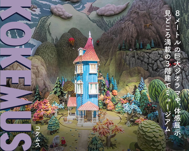 地上3階建の展示施設「コケムス」は、フィンランド語で“体験”を意味します。。日本で初めてのムーミンの常設展スペース、小説や絵本の世界の紹介、8m超のムーミン谷の巨大ジオラマや、フィンランドのヘルシンキ・アート・ミュージアムからのアート作品など、多彩な展示をお楽しみいただけます。