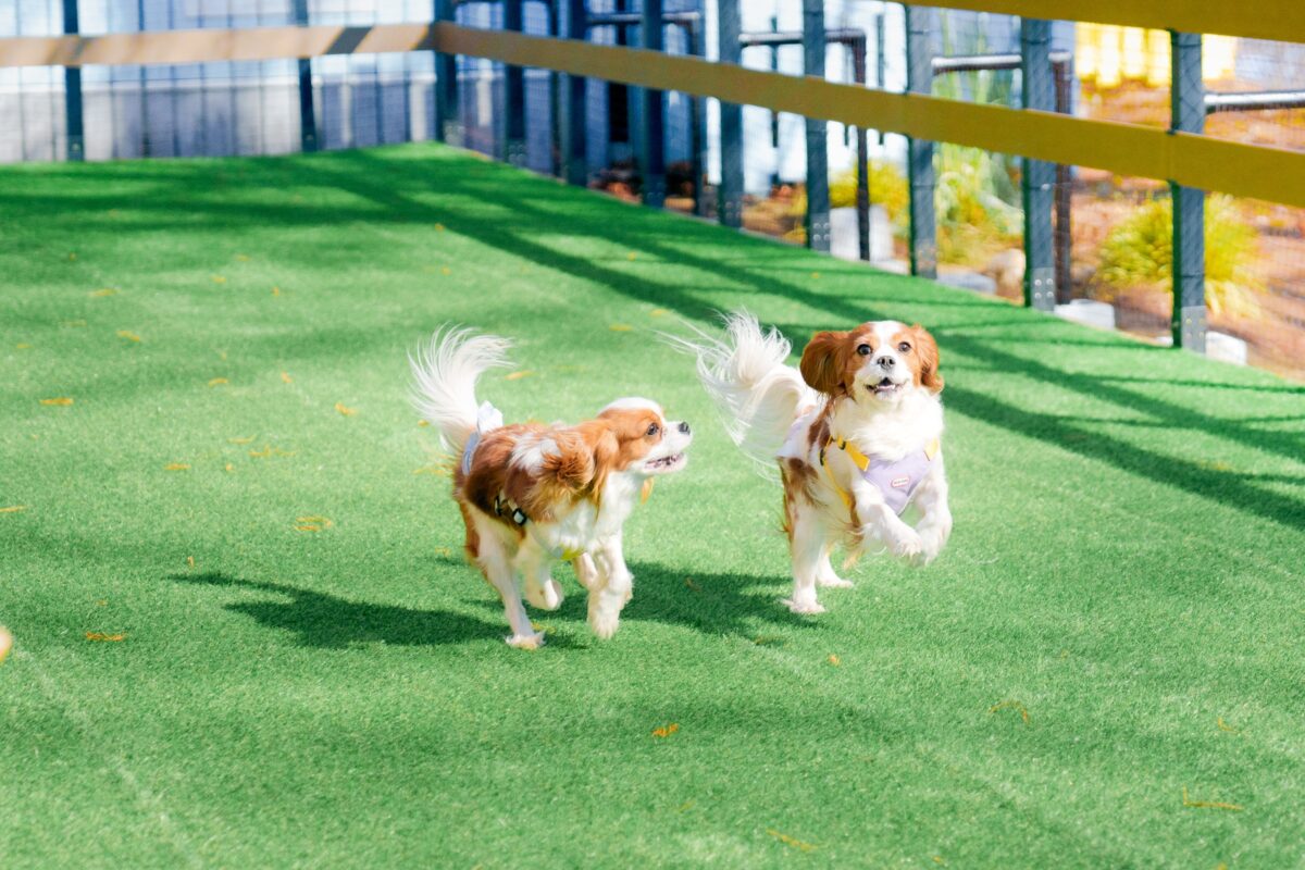 海のオーケストラ号の前にあるテラスが小型犬・中型犬専用のドッグランスペースに!日当たりのいい空間と毛足の長めの人工芝が敷かれた空間で、のびのびとした時間をお過ごしください!