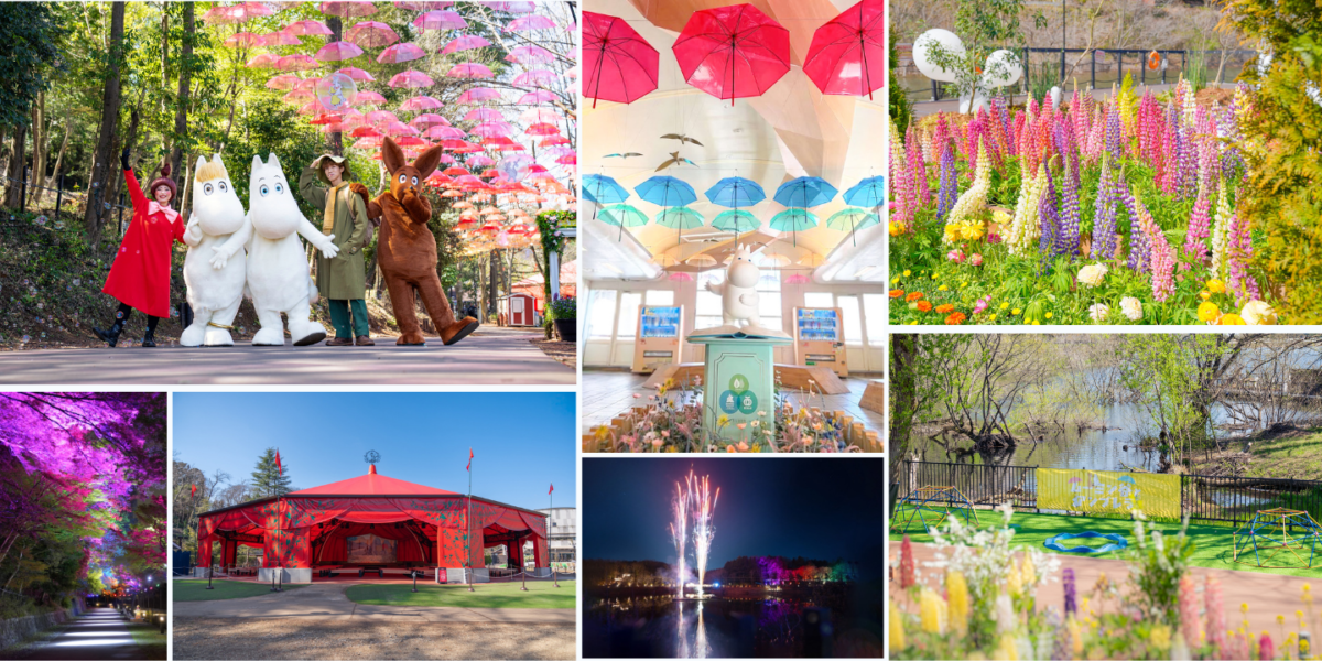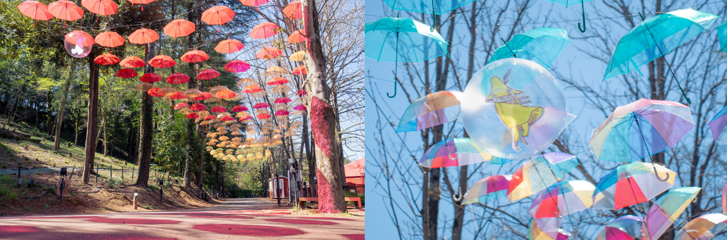 豊かな緑に包まれたパーク内では、頭上に揺れる色とりどりの傘が織りなすカラフルな景色に加え、夜間は幻想的なライトアップを実施。さらに、期間中は「ムーミン谷の湖上花火大会」を毎晩開催し、春の夜空を華やかに彩ります。また、西武鉄道飯能駅では「ムーミン谷とアンブレラ」イベントと連動してムーミンのオブジェの上空をアンブレラが彩ります。さらに東飯能駅ではムーミンママのオブジェがお出迎え。無料シャトルバスも運行中なので、アクセスも快適です。