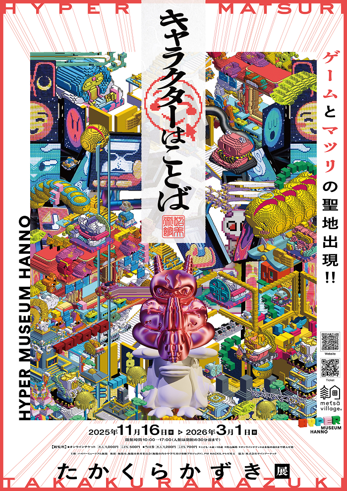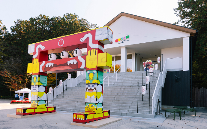 デジタルとリアルが交差する、たかくらかずきの世界がハイパーミュージアム飯能に集結!オニやカッパ、十二支など個性豊かなキャラクターが会場を彩り、アートとして鑑賞するだけでなく、実際にゲームとして遊べる体験も用意されています。会場の中央には高さ約4mの巨大守護神「ハイパーマン」も登場し、自然あふれる会場に“ゲーム×マツリ”の新しい空間が広がります!