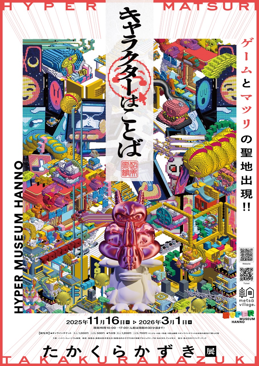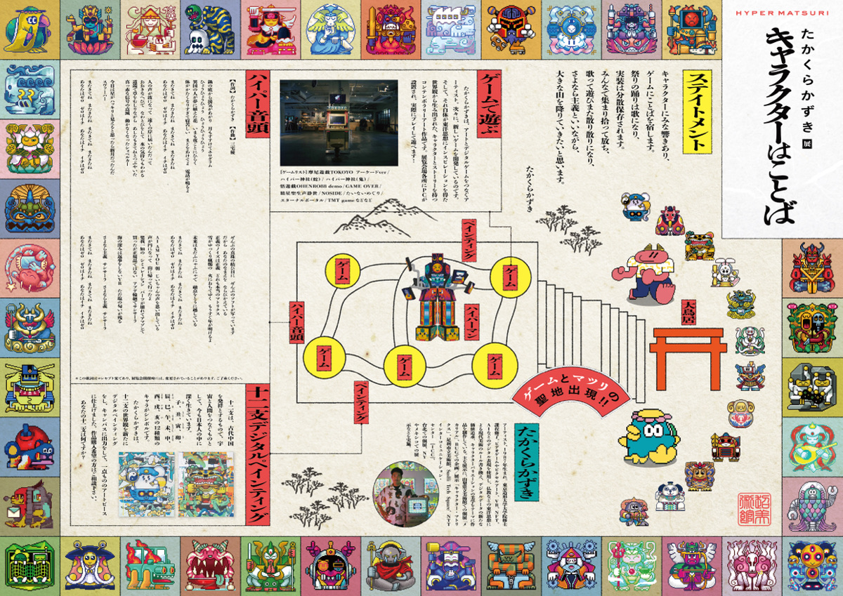 展覧会場の中や外に、オニとカッパや十二支、仏教神道、妖怪変化など、彼が生み出すキャラクターが集結。たかくらが過去に作った10種類以上のゲーム作品が期間ごとに入れ替わり展示され、プレイできます。そして、GINZA SIXにも登場した4メートルの巨人『ハイパーマン』を中心とする大型インスタレーション空間が出現。ハイパー音頭とARキャラクターたちが各所に出現。展覧会中に、神楽、初詣、神輿などのイベントも盛りだくさんで計画中です。