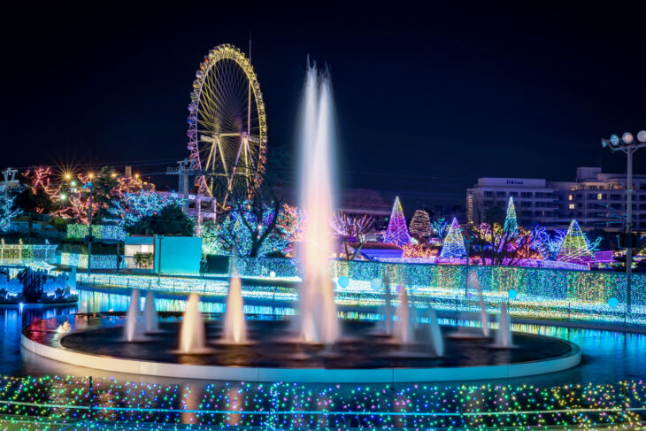 夜空と光が織りなすショーや、プロジェクションマッピングの演出もあり、圧巻のイルミネーションを心ゆくまで楽しめるのが魅力です。