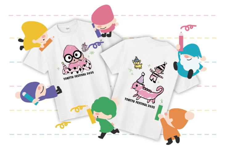 トントゥフェス2025のために障がいのあるクリエイターが特別に描き下ろしたイラストを、ご自身のTシャツにシルクスクリーンでプリントできます。