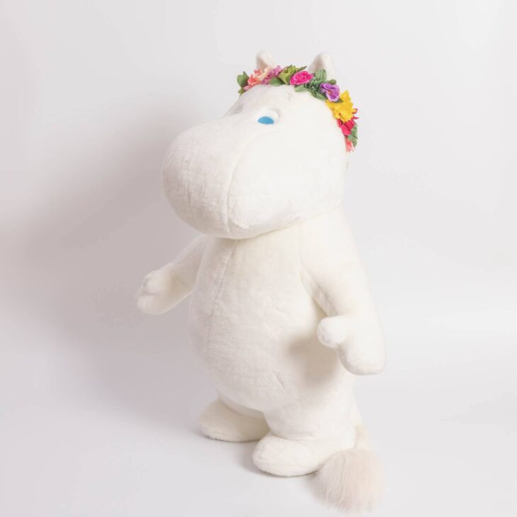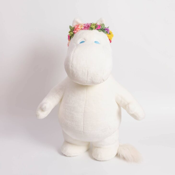 色鮮やかなお花の冠(花かんむり)を頭にちょこんと乗せたムーミントロール。