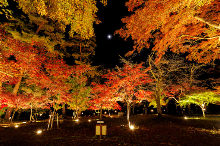 11月の紅葉まつり期間中にはライトアップも行われ、昼の鮮やかさから一転、柔らかな光に包まれた幻想的な世界が広がります。