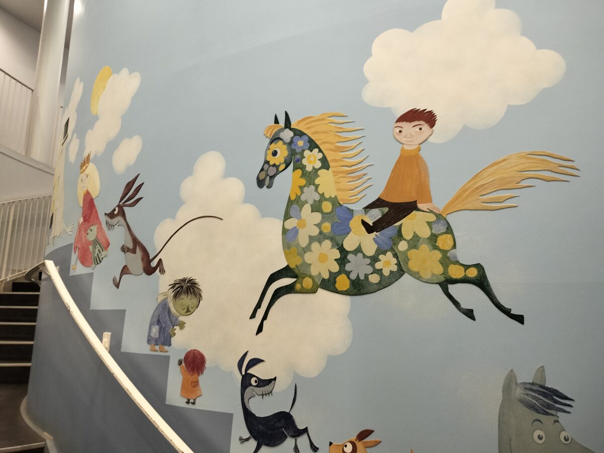 コケムスのらせん階段に再現されている、アウロラこども病院の壁画”遊び”。これはムーミンの物語の作者トーベ・ヤンソンが、病院を意識させない、子どもたちをワクワクさせる、楽しく検査室まで誘導する、などのリクエストに応えて、壁いっぱいにムーミンたちが上階に向かって駆け上がっていく様子を描いた作品です。この壁画の中にも、花柄のうまが描かれています。