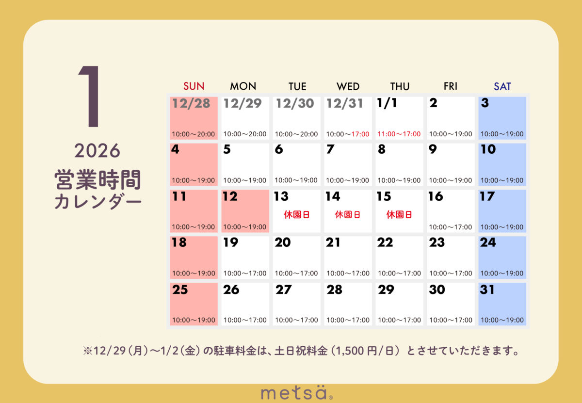 2026年1月1日(木):10:30~18:00 ※最終入庫 17:00