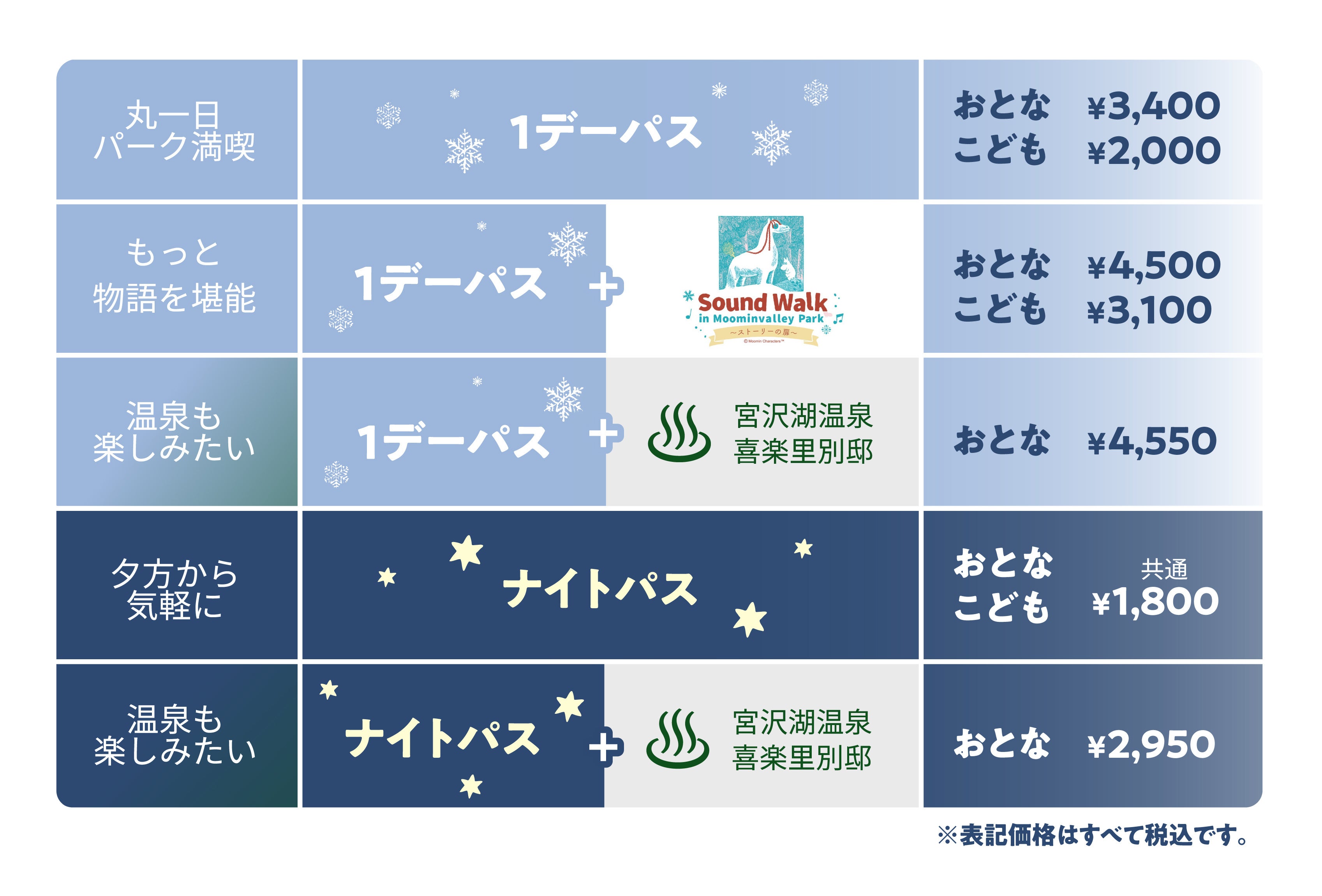 昼から夜まで丸一日楽しみたい方は【1デーパス】、夕方からじっくりライトアップを楽しみたい方は【ナイトパス】、もっとムーミンの物語の世界を体感したい方は【サウンドウォーク】付きチケットがお選びいただけます。冷えた体を温める、「宮沢湖温泉 喜楽里別邸」ご入館セットも販売しています。