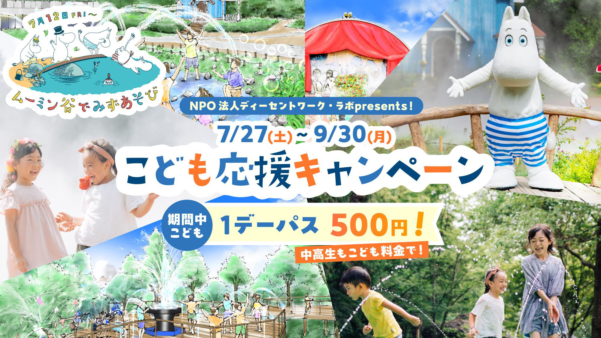 株式会社ムーミン物語(本社:埼玉県飯能市、代表取締役社長:小幡匡志)が運営する「ムーミンバレーパーク」は、NPO法人ディーセントワーク・ラボの特別企画により、7月27日(土)~9月30日(月)の期間、「こども応援キャンペーン」を実施いたします。キャンペーン中は高校生以下を対象に、1デーパスを500円でお楽しみいただけます。この夏、最高の思い出を作るために、楽しい体験が満載のムーミンバレーパークで特別な夏のひとときをお楽しみください!