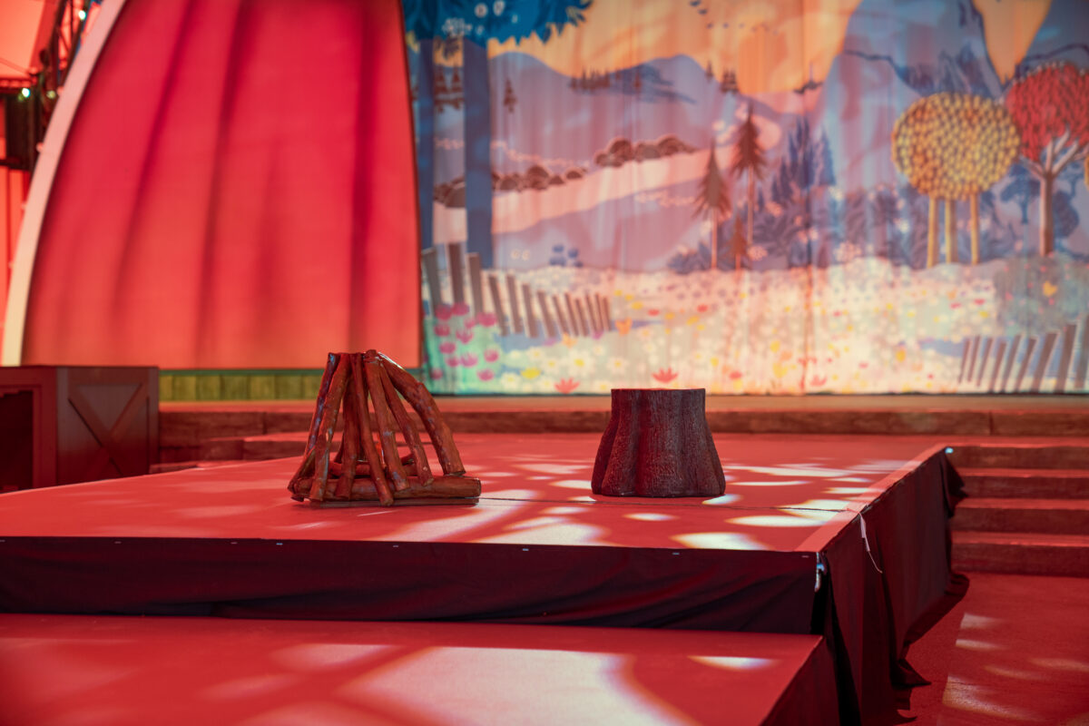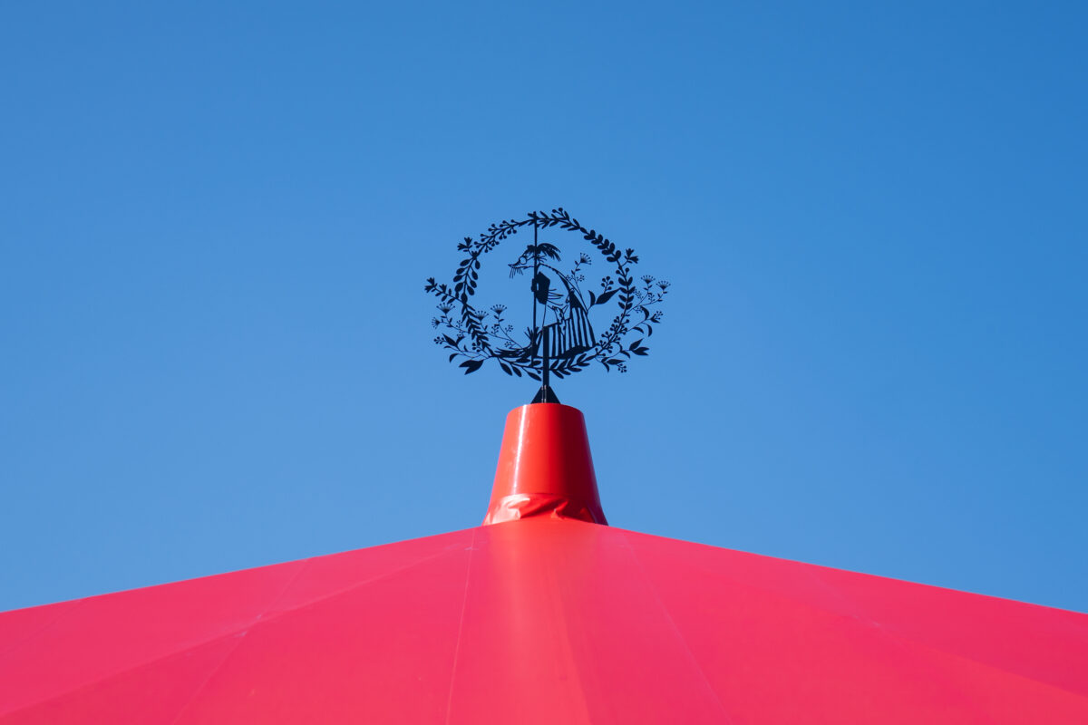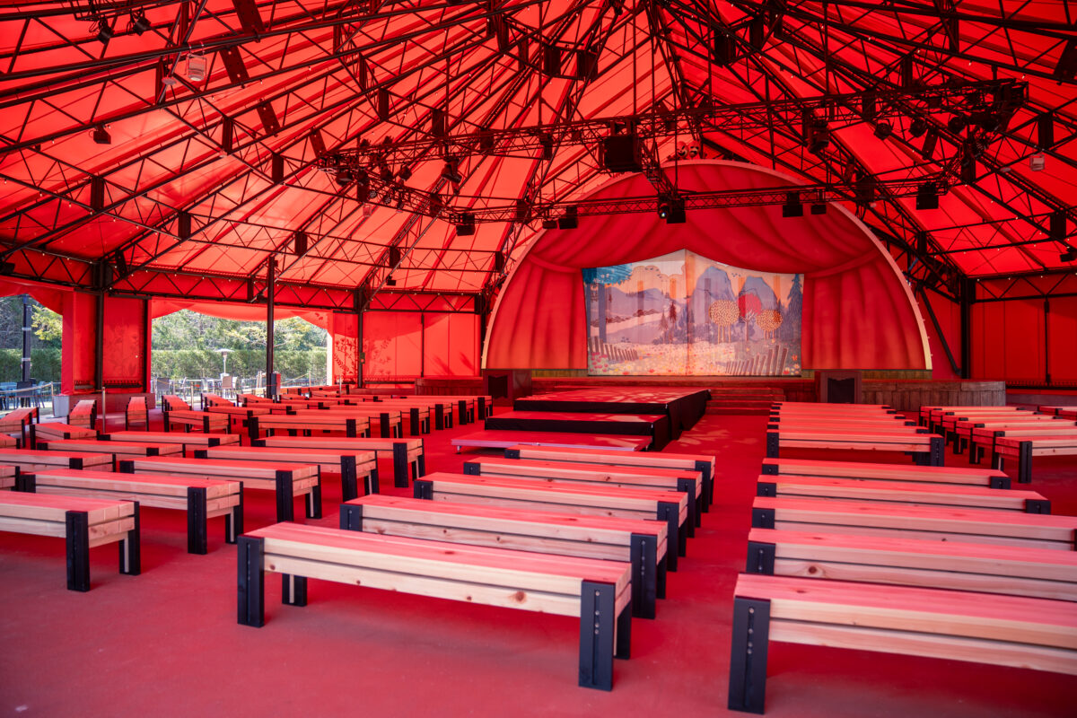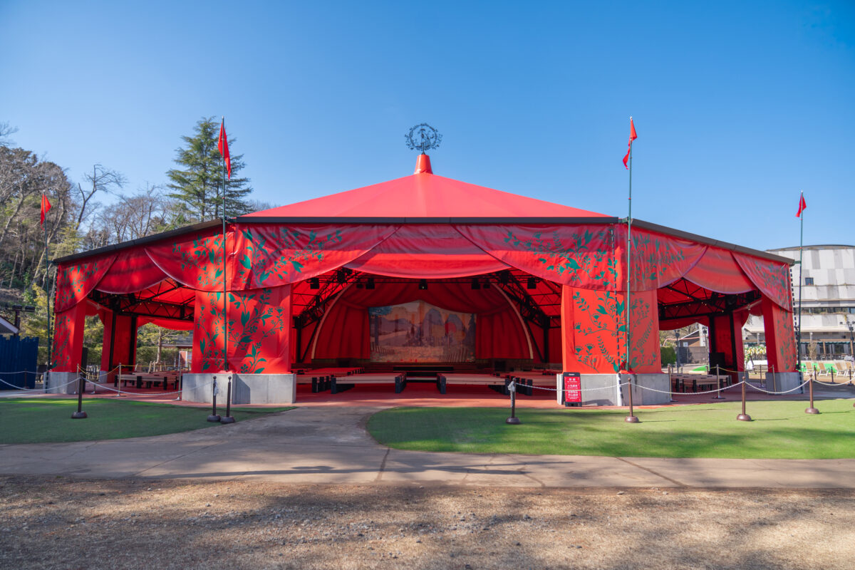 赤地にアイビーの葉の模様が印象的な大型テントを備え、進化を遂げた「全天候型シアター」。テントの頂点には、劇場の名前の由来となった「エンマ」のシルエットを模した飾りが取り付けられ、雨や日差しが遮られた、天候に左右されず物語の世界へ没入できる空間が整いました。客席には飯能の「西川材」を使用したベンチが並び、木のぬくもりに包まれた快適な鑑賞体験を提供します。