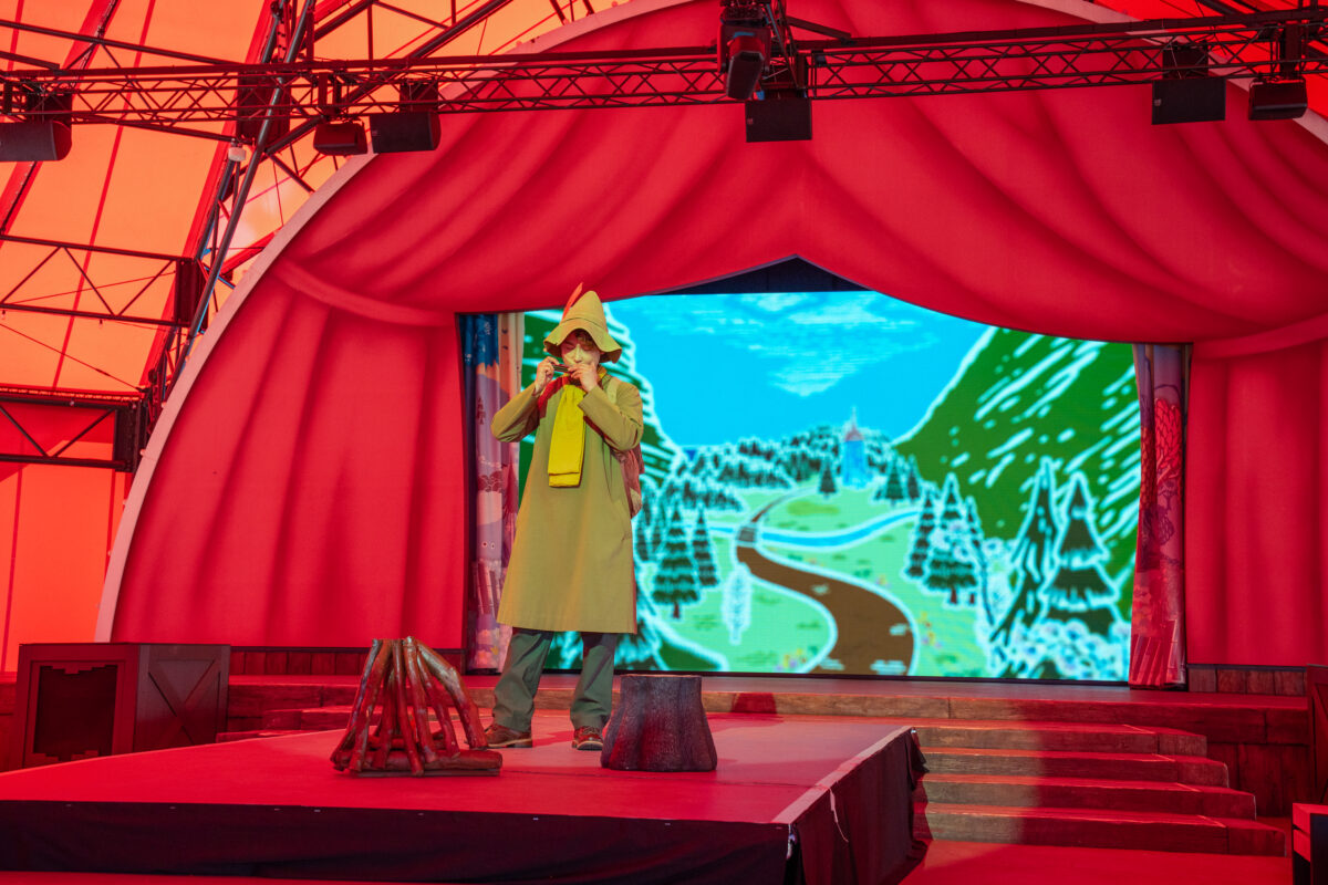 「エンマの劇場」は、大型テントを備えた待望の全天候型シアターとしてリニューアル。さらに新たな音響・照明・映像システムに加え、地元飯能市の「西川材」を使用したぬくもりあるベンチを完備した、一日を通してムーミン谷の仲間たちによるショーや、映像×音の演出が楽しめるムーミンバレーパークの新たなランドマークとなります。