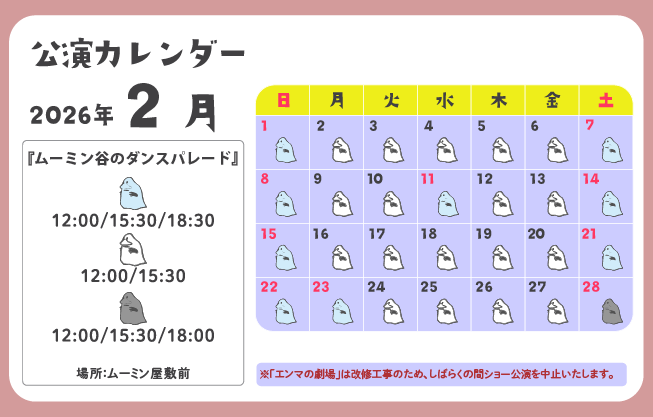 | 営業時間 | 『ムーミン谷のダンスパレード』 ・2026年1月2日(金)~12日(月・祝) 12:00/15:30/18:30 ・2026年1月16日(金)以降 土日祝 12:00/15:30/18:30 平日 12:00/15:30 ※ショー開始時刻は共通です。 ※ショー終了時刻は各プログラムの公演時間により若干異なります。 |