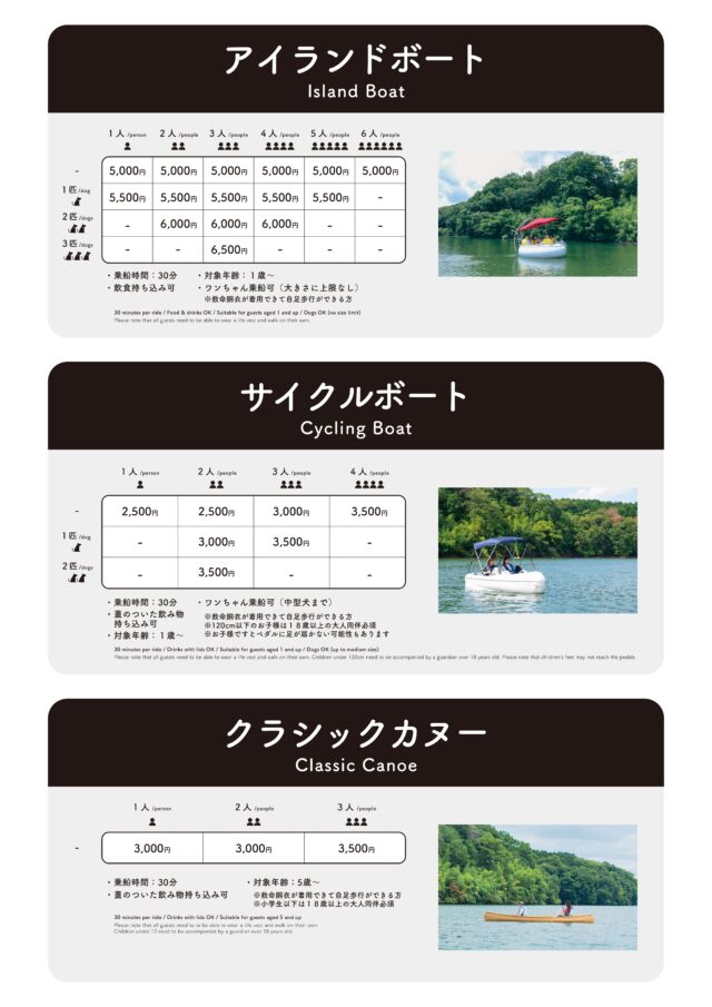 | 料金 | アイランドボート:1台5,000円/30分 ~(ワンちゃん乗船+500円/匹) サイクルボート:1台2,500円/ 30分 ~ クラシックカヌー:1台3,000円/30分 ~ ※価格はすべて税込 |