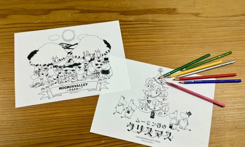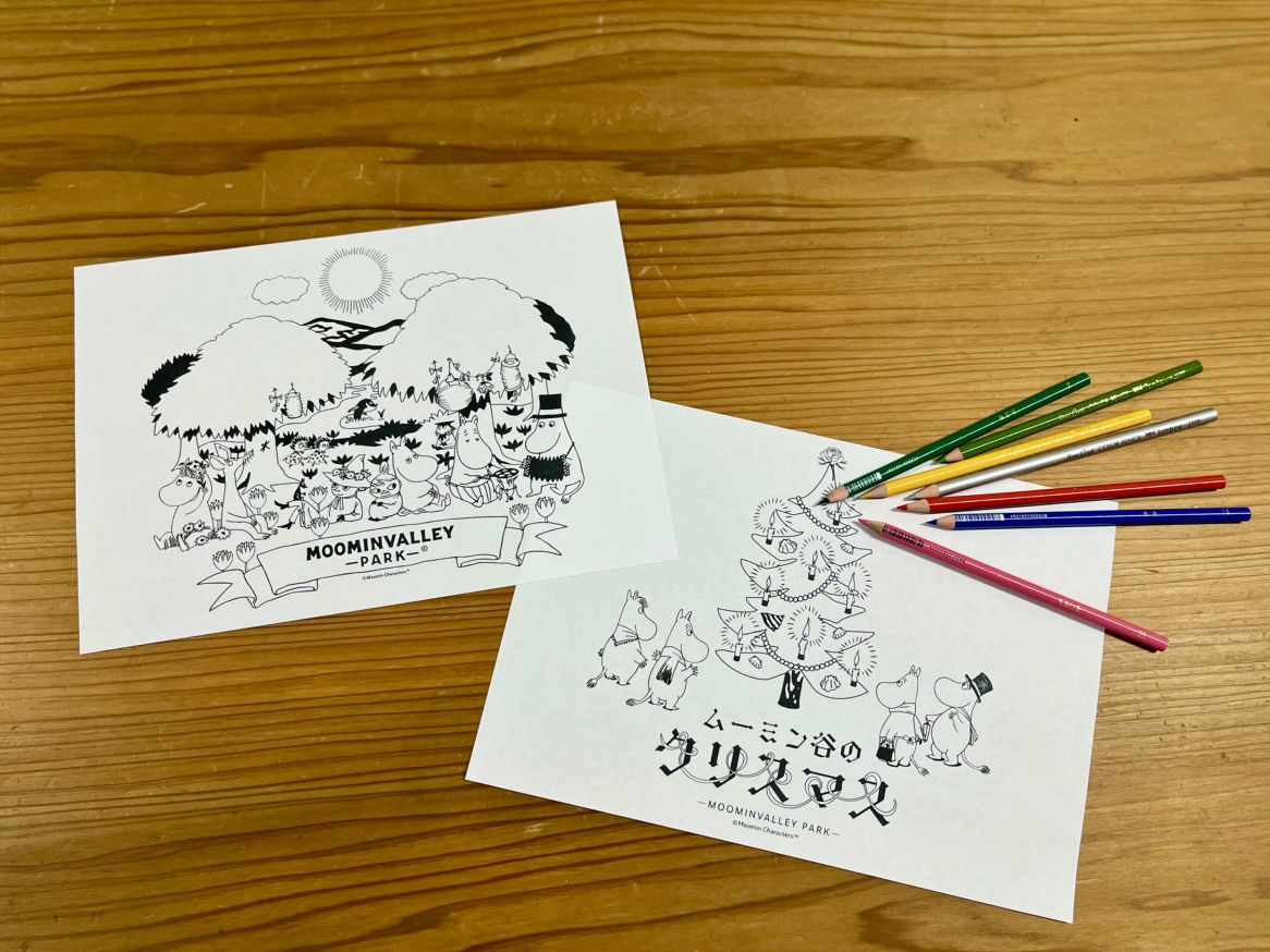 「ムーミンバレーパークロゴ柄」と、「ムーミン谷のクリスマスメインアート柄」の2種類から選べるオリジナルのぬりえワークショップ。