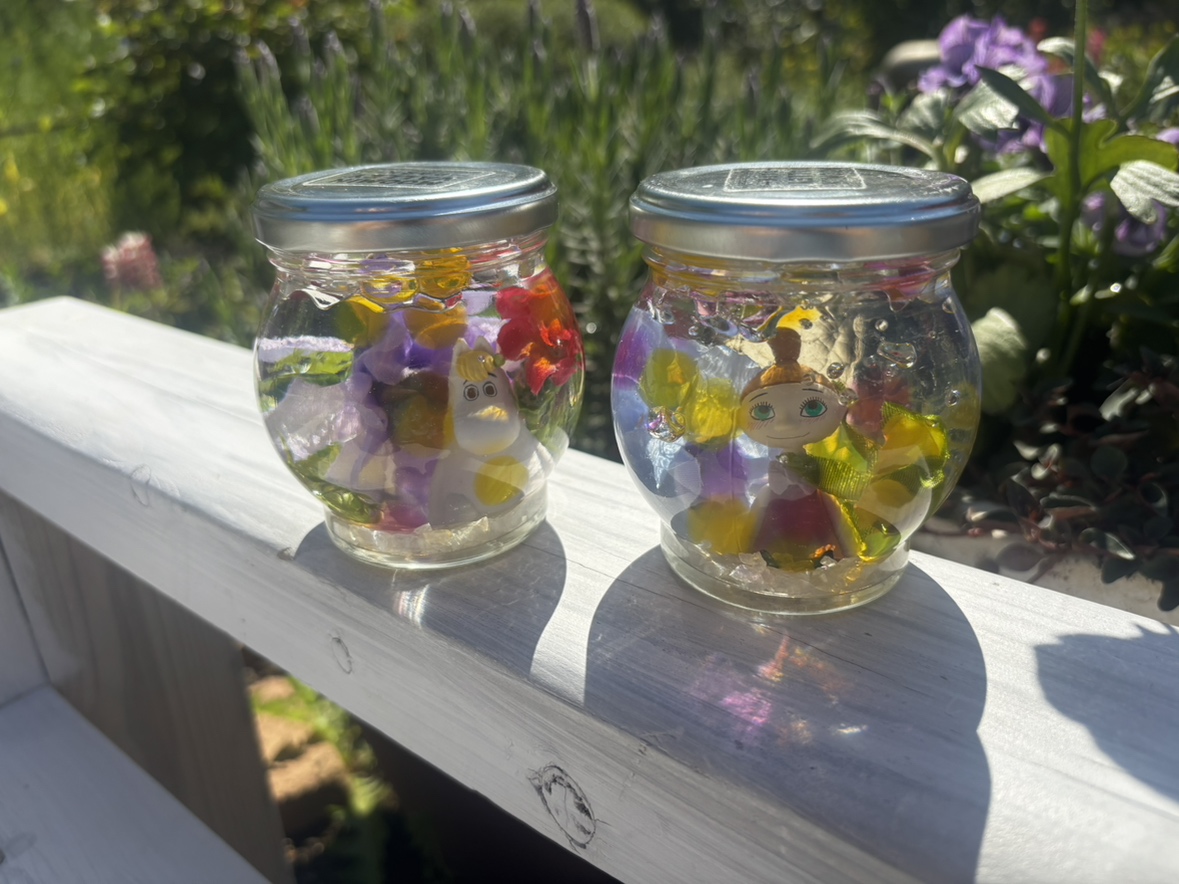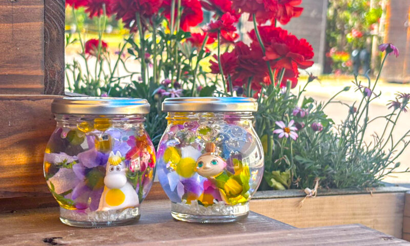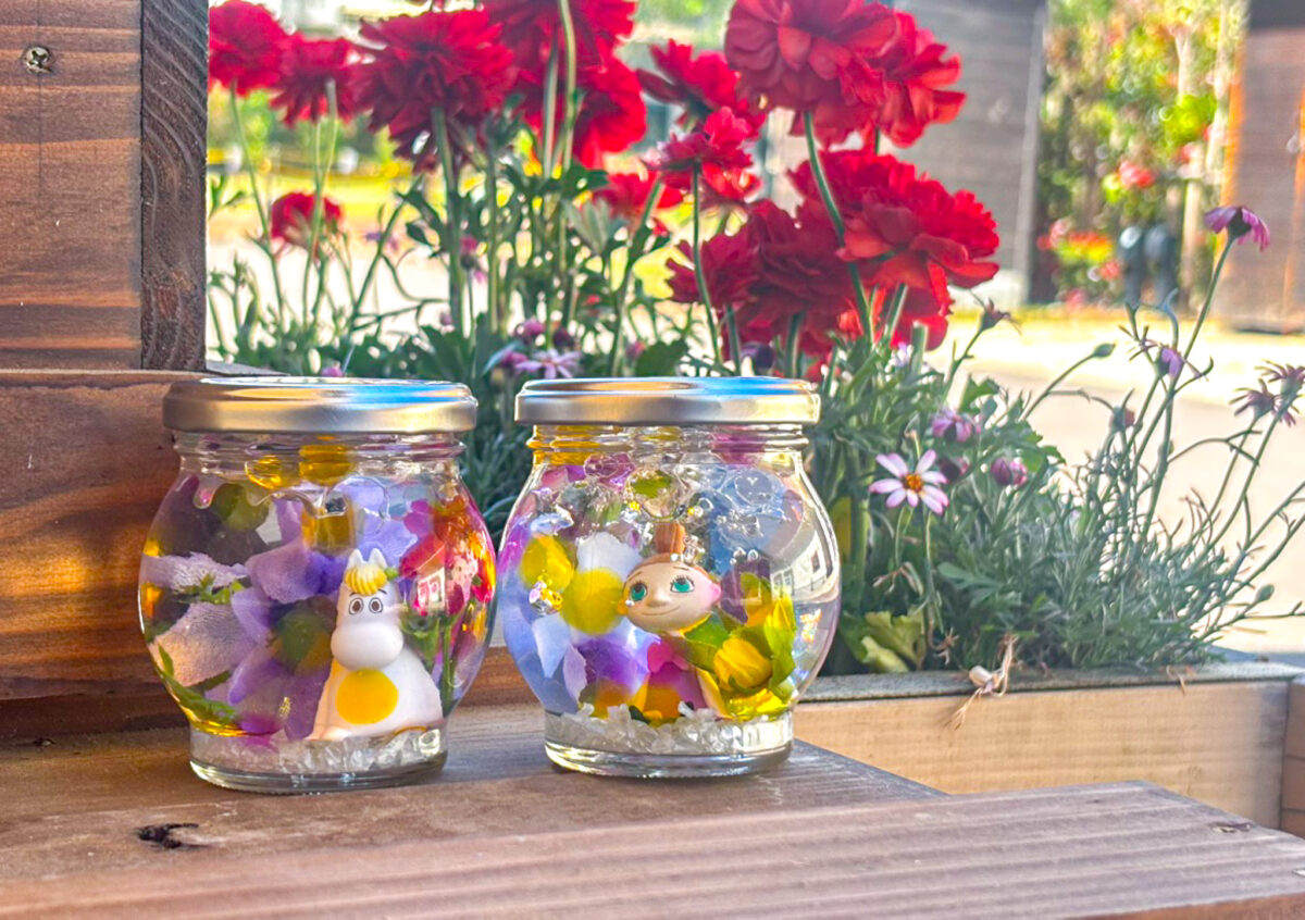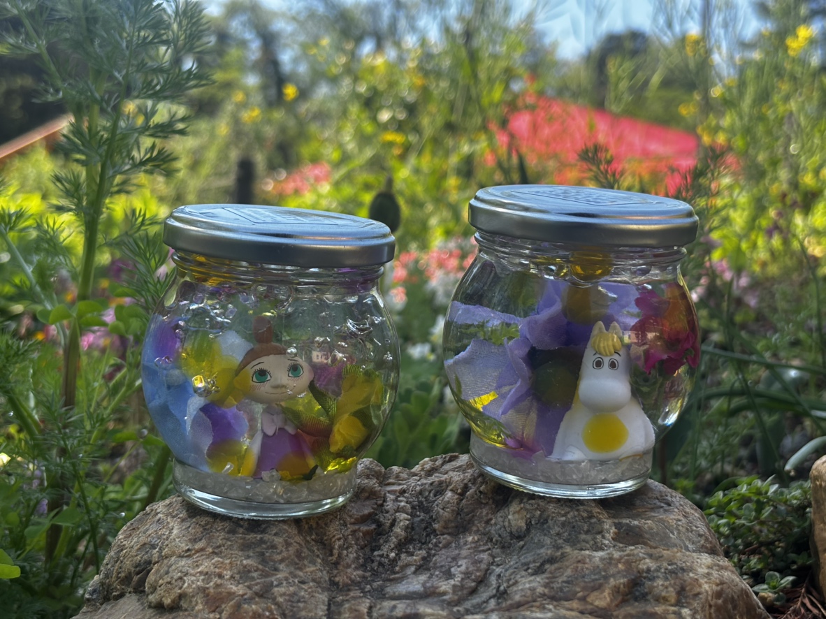 ガラス瓶に消臭ビーズとムーミン谷の仲間たちのフィギュアを入れて、水を注いでいくと……とってもふしぎ!消臭ビーズの中で見えなかったフィギュアが浮かび上がります。まるで水遊びをしているようなムーミン谷の仲間たちの素敵なジオラマが完成します。ぜひムーミンバレーパークの思い出として持ち帰っておうちに飾ってみてくださいね!